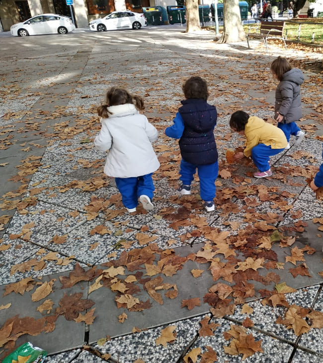 Además, contamos con un entorno privilegiado de parques y columpios donde disfrutamos haciendo diferentes actividades con los más mayores de la escuela, recogida de hojas del otoño, de flores de primavera, salidas al mercado, o sólo una jornada divertida de columpios.